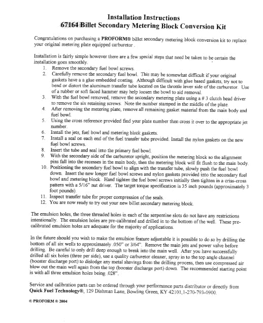 | Feature/Benefit | For single inlet vacuum secondary carburetors to replace the original metering plate with a billet metering block., For single inlet vacuum secondary carburetors to replace the original metering plate with a billet metering block., Kit includes longer fuel bowl screw, longer transfer tube and all necessary gaskets, seals, etc. |